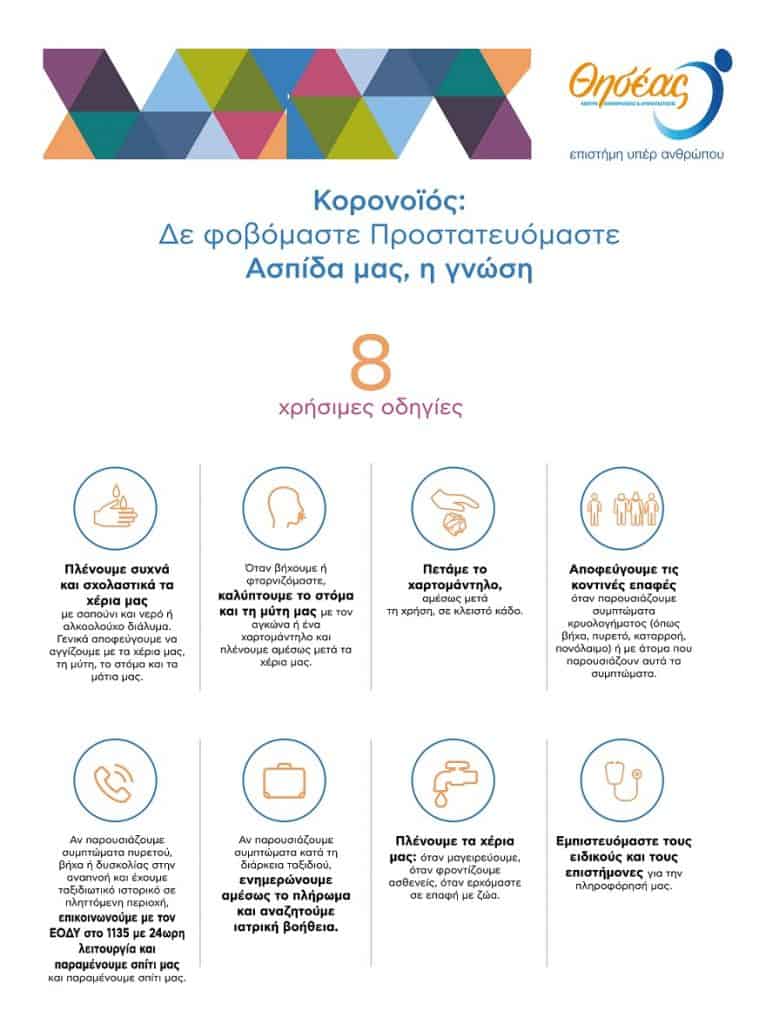 Δείτε μερικές χρήσιμες οδηγίες για απλά μέτρα πρόληψης από τον κορονοϊό καθώς και αντιμετώπισης σε περίπτωση που κάποιος παρουσιάσει συμπτώματα.