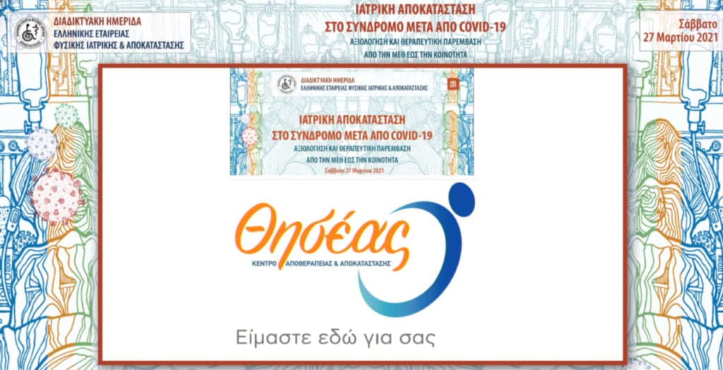 O ΘΗΣΕΑΣ συμμετείχε ως χορηγός στη διαδικτυακή ημερίδα που διοργάνωσε η Ελληνική Εταιρεία Φυσικής Ιατρικής & Αποκατάστασης, το Σάββατο 27 Μαρτίου 2021 και έδωσε για ακόμη μια φορά το παρόν στα τεκταινόμενα, στο χώρο της υγείας, αναφορικά με την πανδημία του SARS-Cov-2.