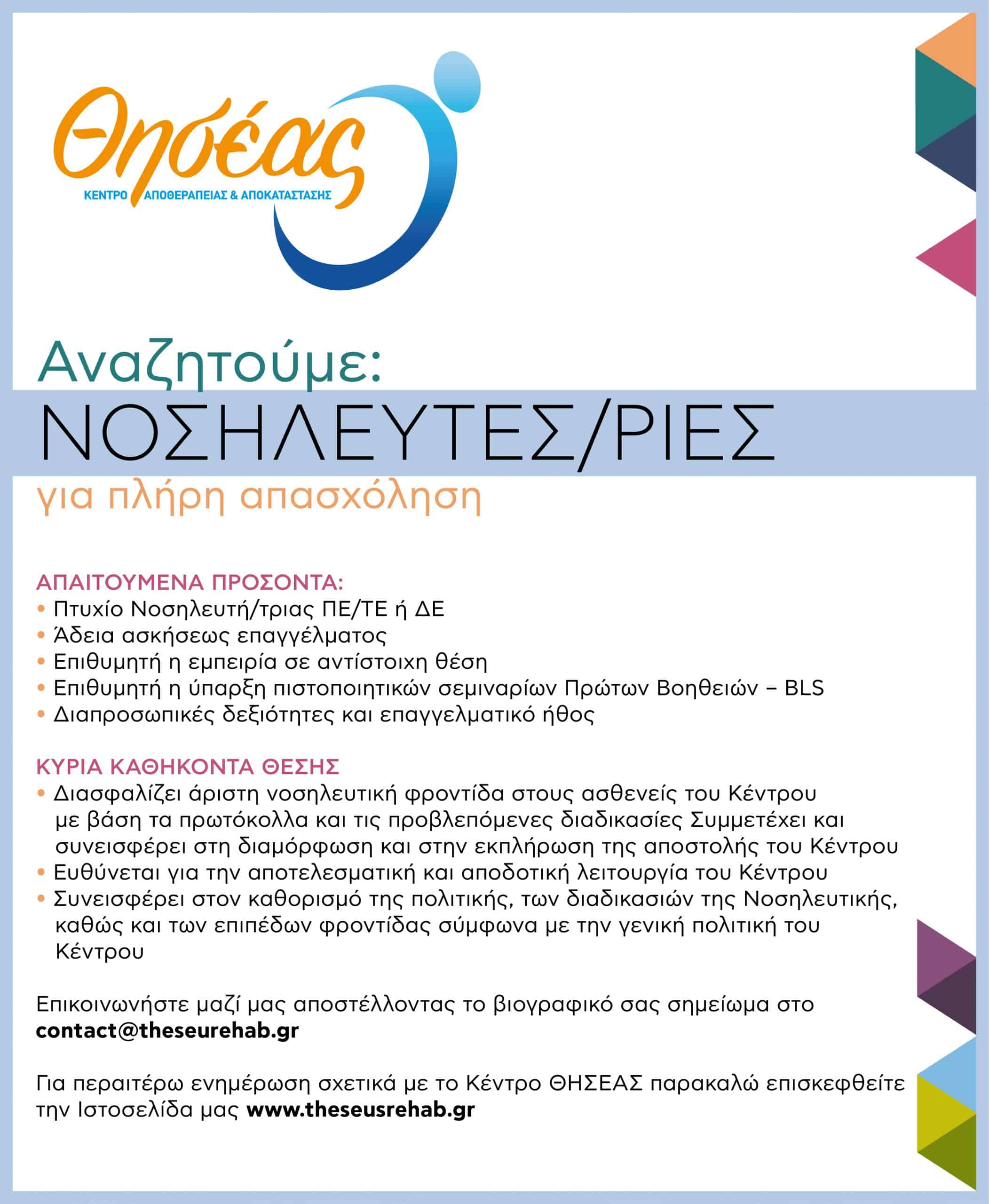 Το Κέντρο Αποθεραπείας & Αποκατάστασης ΘΗΣΕΑΣ ΑΕ που βρίσκεται στην Καλλιθέα, επί της Λεωφόρου Συγγρού αρ. 202 & Αγίων Πάντων, ζητά Iατρό με ειδικότητα Παθολόγου για πλήρη απασχόληση.